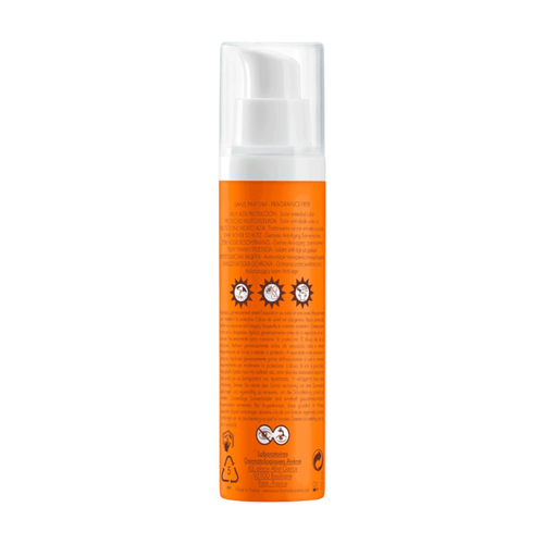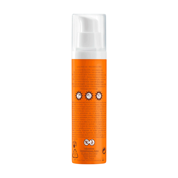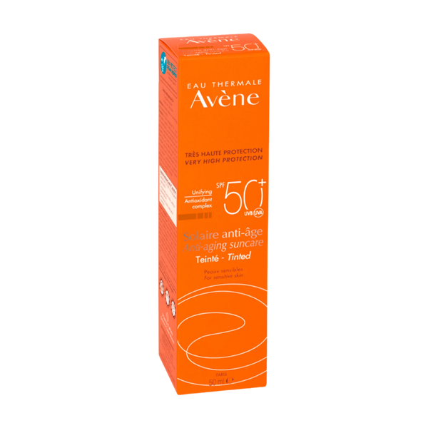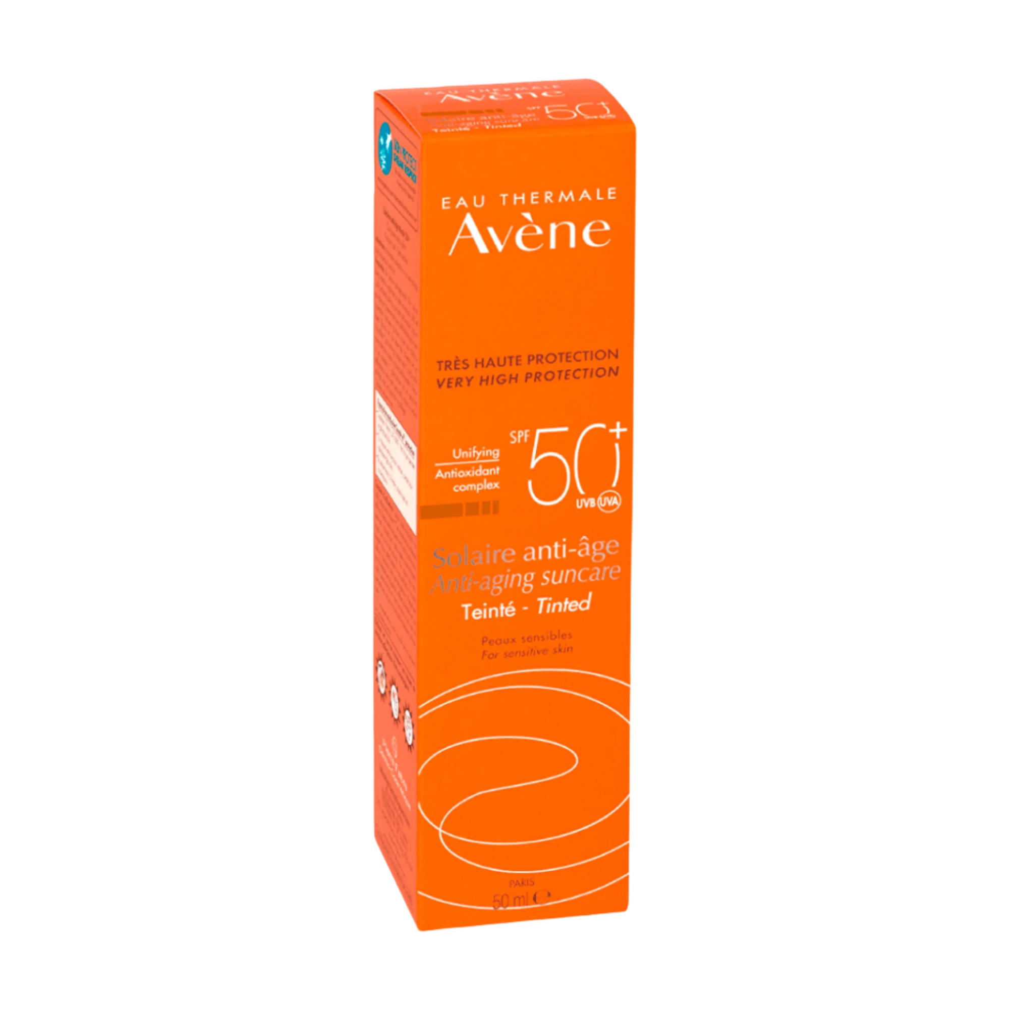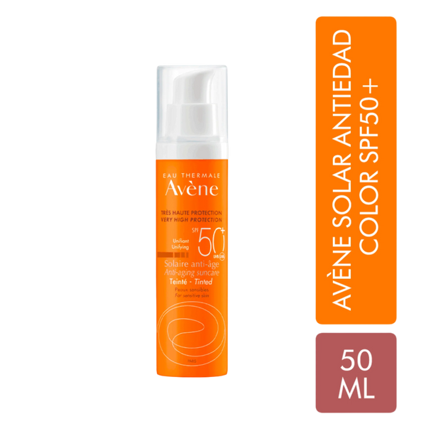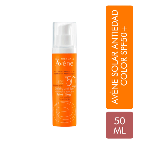 AVÈNE Solar Antiedad Color SPF 50+ es un fotoprotector facial de muy alta protección UVA/UVB, que incorpora activos antiedad para prevenir y corregir los signos del envejecimiento solar. Su fórmula contiene Ascofilina™, un activo que estimula la síntesis de colágeno, y Pre-tocoferil, antioxidante que protege contra los radicales libres. Además, incluye pigmentos minerales que unifican el tono y brindan un acabado natural. Su textura ligera, no grasa y resistente al agua lo convierte en una excelente opción para el uso diario en pieles sensibles, maduras o con manchas.