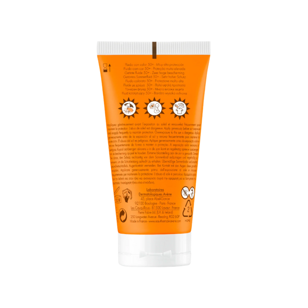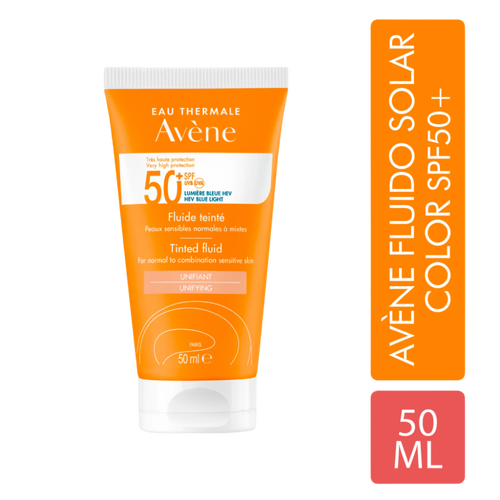 Avène Solar Fluido Color SPF 50+ es un fotoprotector facial con color que ofrece muy alta protección solar de amplio espectro (UVA/UVB). Su fórmula ligera está diseñada para pieles sensibles y brinda un acabado natural, uniforme y sin brillos. Gracias a los pigmentos minerales, unifica el tono y disimula imperfecciones, sin efecto máscara. Enriquecido con pre-tocoferil (antioxidante) y Agua Termal de Avène, ayuda a proteger la piel del estrés oxidativo y a calmarla. Su textura fluida y no grasa es ideal para uso diario.