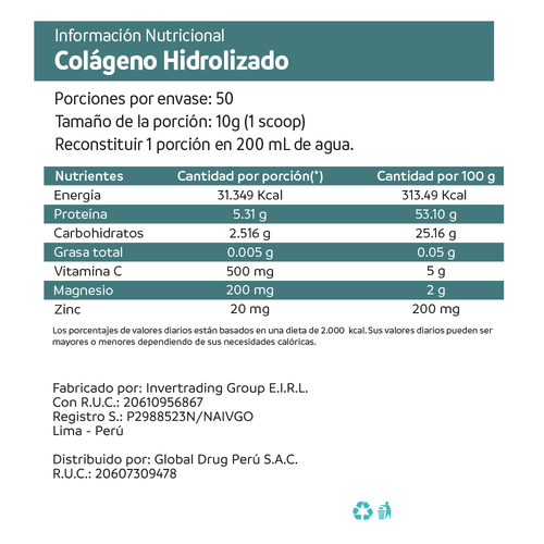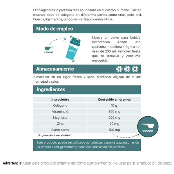 Concentración por toma: 10 gr de Colágeno, 200 mg de Magnesio, 500 mg de Vitamina C, 20 mg de Zinc y 100 mg de Camu Camu.