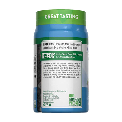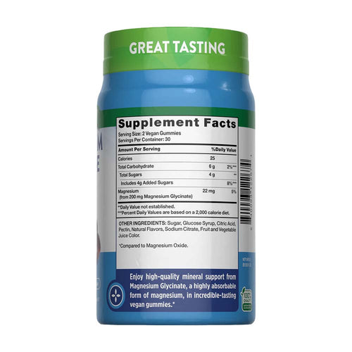Las Gomitas de Magnesio Glicinato de Nature’s Truth están formuladas para brindar una fuente de magnesio de alta biodisponibilidad en una presentación deliciosa y fácil de consumir. El magnesio glicinato es una forma quelada conocida por su excelente absorción y baja probabilidad de causar molestias digestivas, ideal para apoyar la relajación muscular, la salud del sistema nervioso y el descanso reparador.