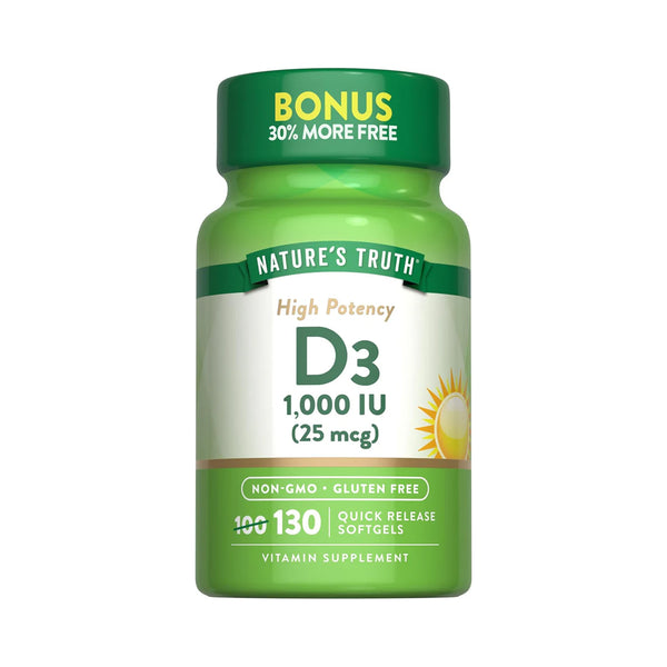 La Vitamina D3 1,000 UI de Nature’s Truth proporciona una dosis óptima de esta vitamina esencial, también conocida como “la vitamina del sol”. La D3 (colecalciferol) es la forma más activa y biodisponible de vitamina D, ideal para fortalecer huesos y dientes, apoyar la función inmunológica y facilitar la absorción del calcio en el organismo.